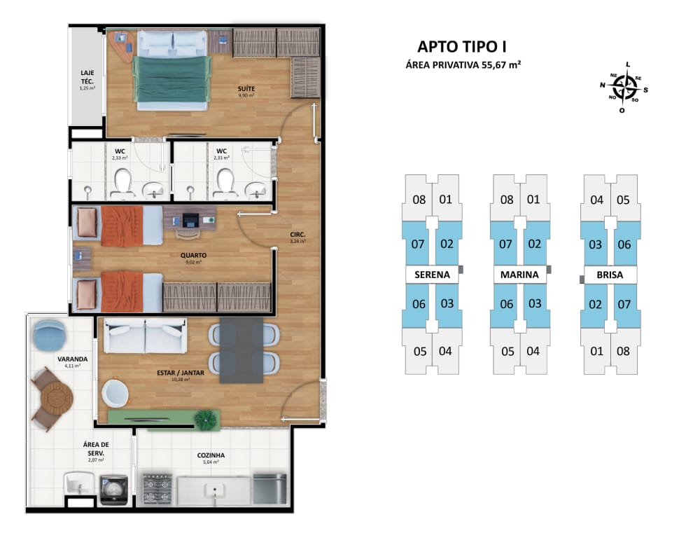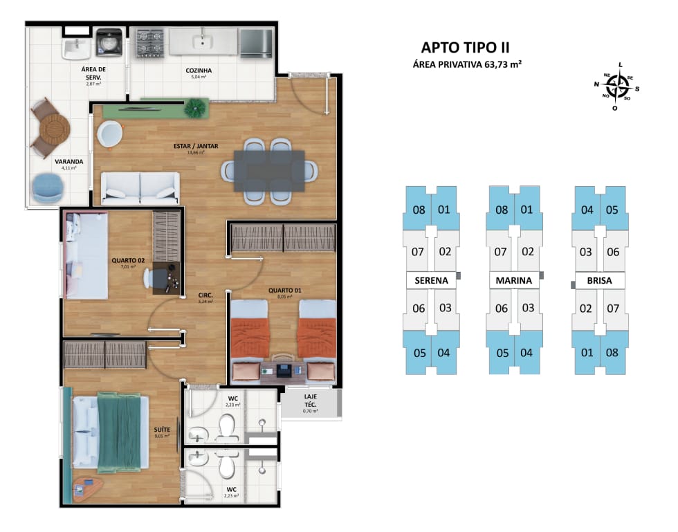 Apartamentos de 2 quartos com suíte e área privativa de 55,67m²; Apartamentos de 3 quartos com suíte e área privativa de 63,73m².